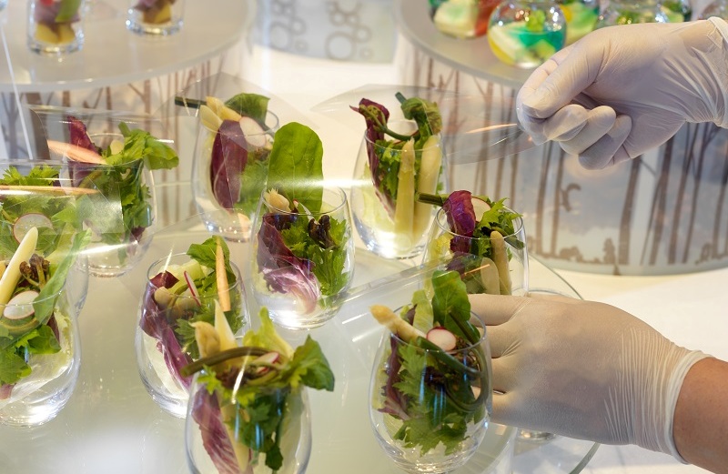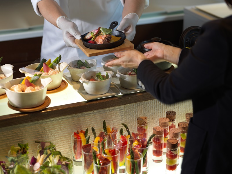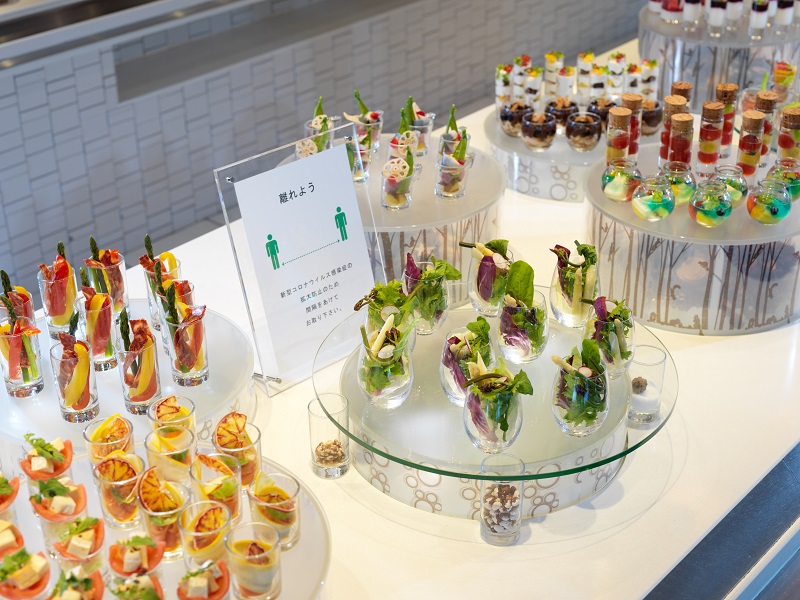 取り分ける際にはお客様同士の間隔をあけていただくようお願いしております。飛沫防止のため、お料理に蓋や透明な防菌フィルムをセットする等の対策をしています。