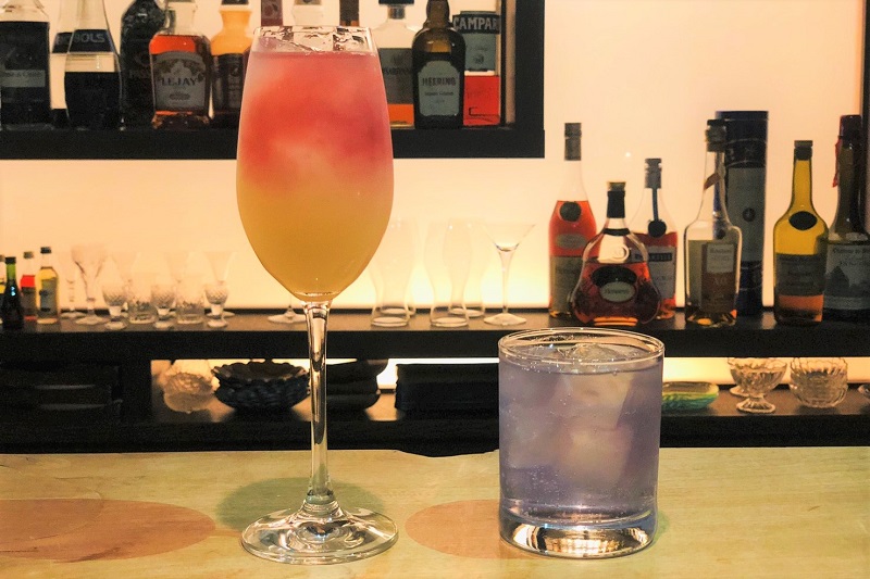 中でもおすすめは、アぺオリジナルのカクテルセット。ジンベースの「湖水の輝き」と桃リキュールの「炎の揺らぎ」の2つのカクテルをご用意しました。