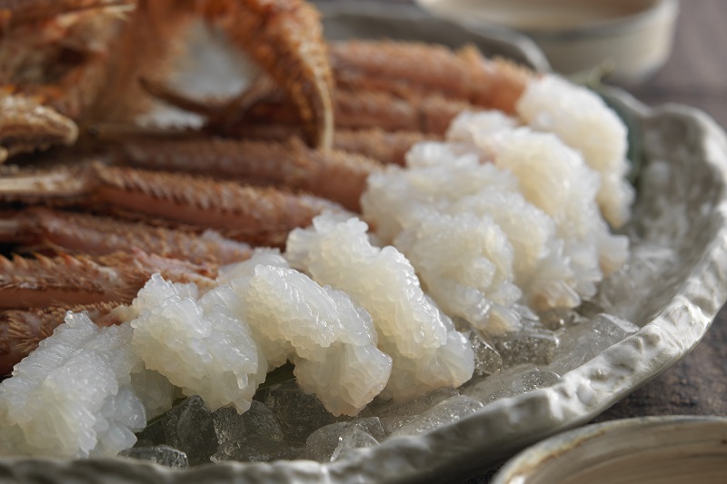 北海道産の毛ガニは身がギュッとしっかり詰まった甘みある味わいです。新鮮だからこそお出しできるお刺身、さらに甘みが増す蒸しのお好きな調理法でお召し上がりいただけます。