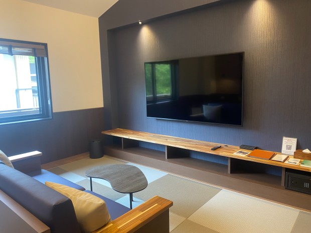 寛ぎの畳スペースやベッド、温泉風呂のバスルームからなる64㎡の和洋室です。