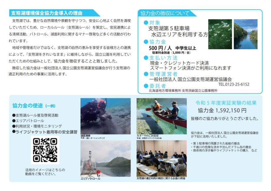 徴収した協力金は一般社団法人 国立公園支笏湖運営協議会が行う支笏湖の適正利用のための事業に活用されます。